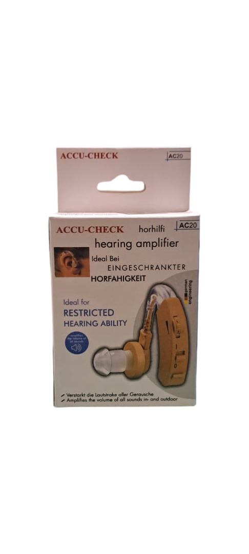 The Hearing Aid Acc-Check AC20 is a reliable and ergonomic solution designed for individuals with restricted hearing ability, offering crystal-clear sound in a lightweight and discreet behind-the-ear design. With adjustable volume control, it allows you to fine-tune your hearing for different environments, whether indoors or outdoors. The soft ear tips ensure a comfortable and secure fit, making it ideal for extended wear. Powered by batteries, the AC20 provides consistent performance and ease of use, while its packaging includes product details in multiple languages (German, French, Italian) for added convenience. Perfect for enhancing conversations, watching TV, or enjoying social activities, the Acc-Check AC20 Hearing Aid combines comfort, versatility, and clarity in one compact device.