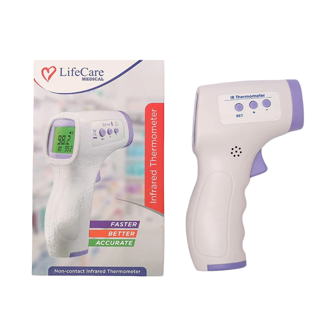 LifeCare Non Contact Infrared Thermometer is a fast, accurate, and convenient solution for measuring body and object temperatures without any physical contact. Engineered with advanced microchip technology and a high-sensitivity infrared sensor, it delivers precise readings in just one second. Designed for safety and hygiene, the thermometer measures from a distance of 1–5 cm, making it ideal for infants, children, adults, and the elderly. With memory storage for up to 50 readings, you can easily track temperature changes over time. Featuring multiple measurement modes and the ability to switch between ℃ and ℉, the LifeCare Non Contact Infrared Thermometer is perfect for home, office, or professional use, providing quick and reliable temperature monitoring for your entire family.
